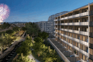 外観デザインとしては上層・中層・基壇部共に庇を多用、駐車場周りの壁面にて水平ラインを活かして邸宅感あるものに、エリア内では広大な敷地かつ接道面が多いですから竣工するとかなり目立つものとなるでしょう。最上階住戸のバルコニー天井部木目調も低層マンションがゆえに外から自然と見えてきますから良い味付けとなっています。もちろん目立ちながらもセットバックをしっかりとして景石&植栽を豊か(南東角にはツリーサークルのある公開広場もある)にすることで周辺から見ても窮屈な印象はないでしょう。