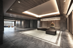 駐車場は地下1階でタワーパーキング3基(地権者用、施設・店舗用、来客用の平置き区画あり)、待合室や車寄せ、そしてコーチエントランスからエレベーターホールへの設えも地下2階と1階部分と統一感あるなどこちらも高級マンションらしい空間となっています。1階部分にも車寄せとサブエントランスがあるため同乗者を先に降ろしたりするだけでなくタクシー利用の際にも重宝しそうです。