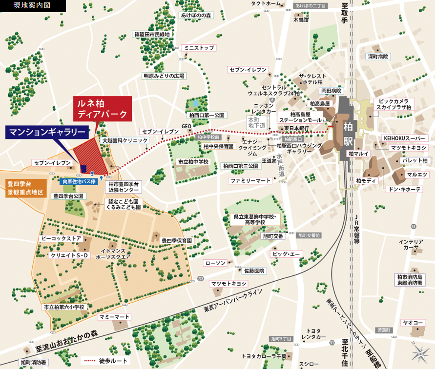 常磐線と東武アーバンパークラインの柏駅から徒歩15分、水戸街道を超えた先の豊四季台エリアでアドレスも豊四季台となります。(旭町アドレスの物件もあり)