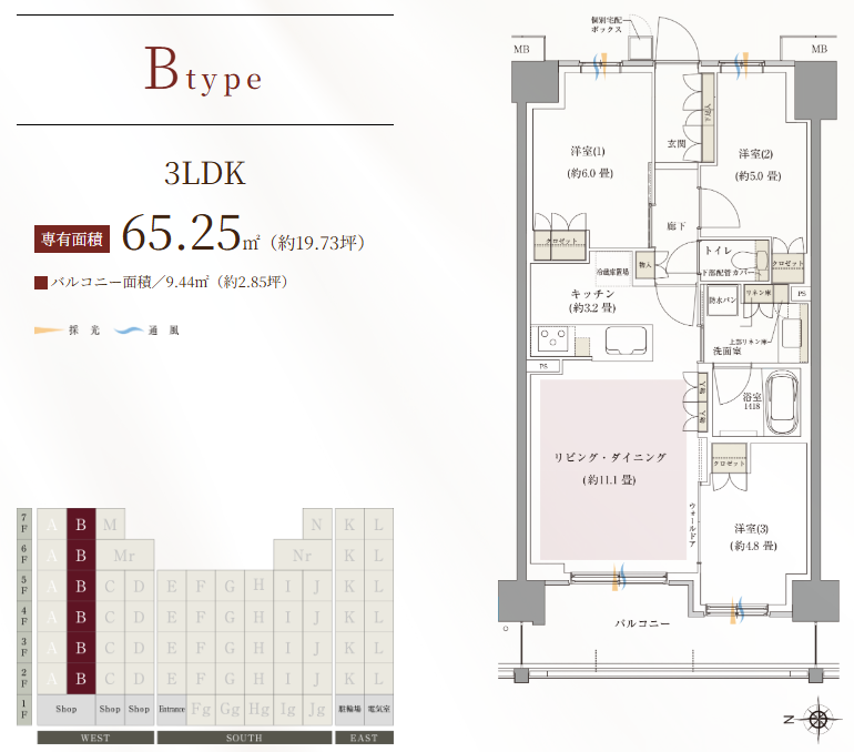 総戸数:65戸(他に店舗区画3戸、フロントオフィス(管理事務室)1戸)