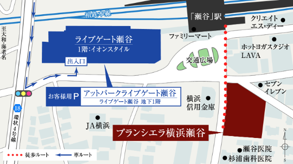 相鉄本線の瀬谷駅南口からロータリーを経由して徒歩2分、以前ご紹介したライオンズ横濱瀬谷ステーションスクエアのようにデッキ直結とはなりませんがザ・駅前立地であることに変わりはありません。