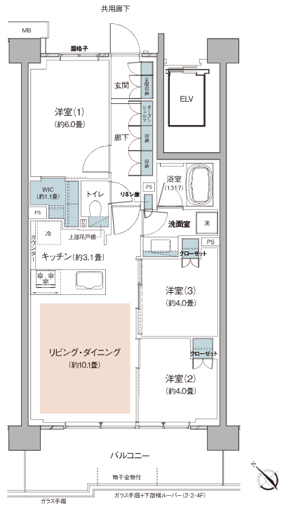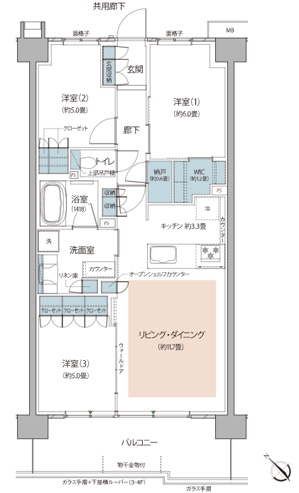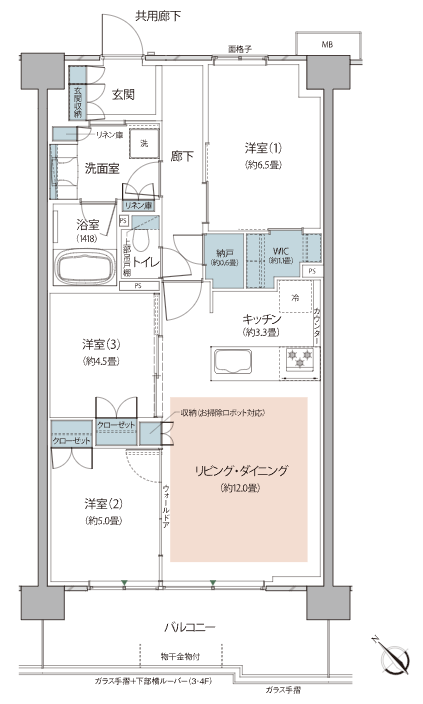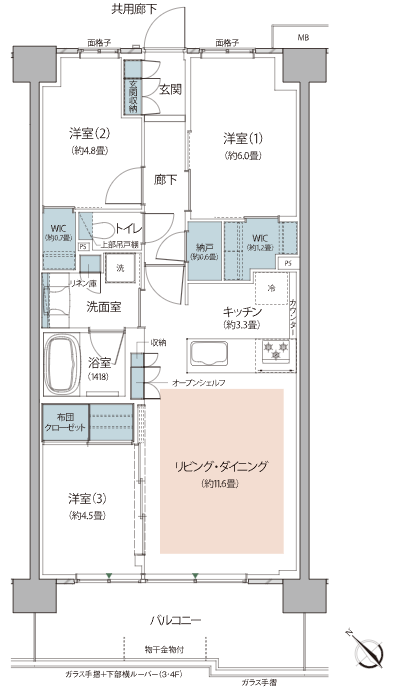 外観デザインはバルコニー側のガラス手摺を乳白色とブラウンで使い分けるだけでなくブラウン部分を少しせり出させることで横に長い建物でありながらも立体感を演出して単調にならないようにしてくれています。隣戸境の隔て板もしっかりとスラブtoスラブです。