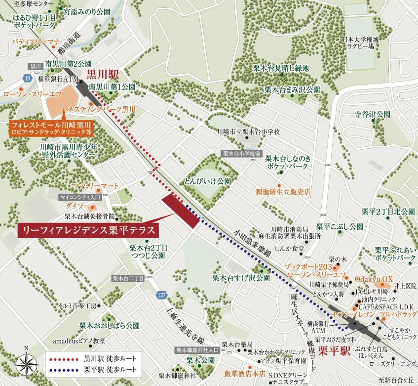 交通:小田急多摩線「黒川」駅徒歩8分 同線「栗平」駅徒歩9分 京王相模原線「若葉台」駅徒歩19分