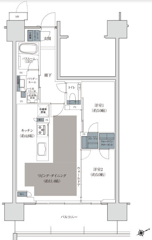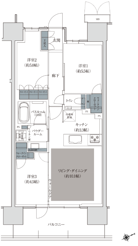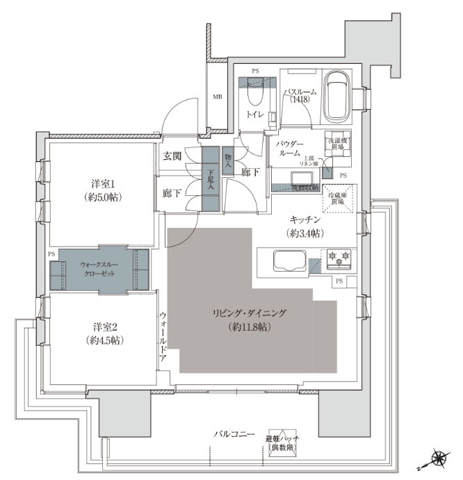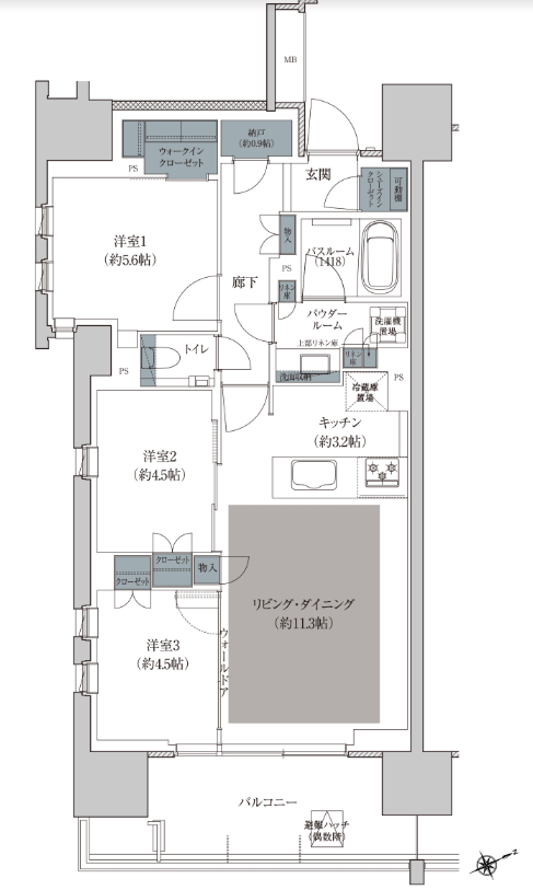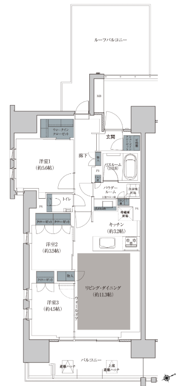 スパンとしては今一つで廊下が長めになってしまっているプランが多いのは気になりますが、連窓サッシというだけでなくバルコニー側の梁の高さを抑えた扁平梁に約2.1mのハイサッシを採用しているため大きくセットバックした東南東向きならではの採光を得られることでしょう。