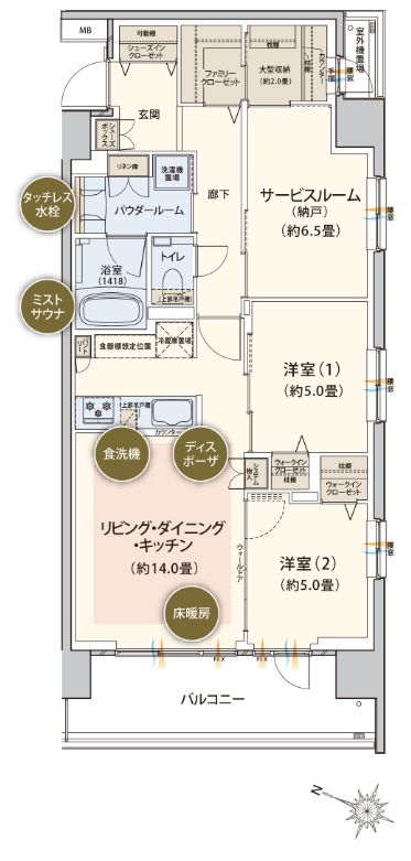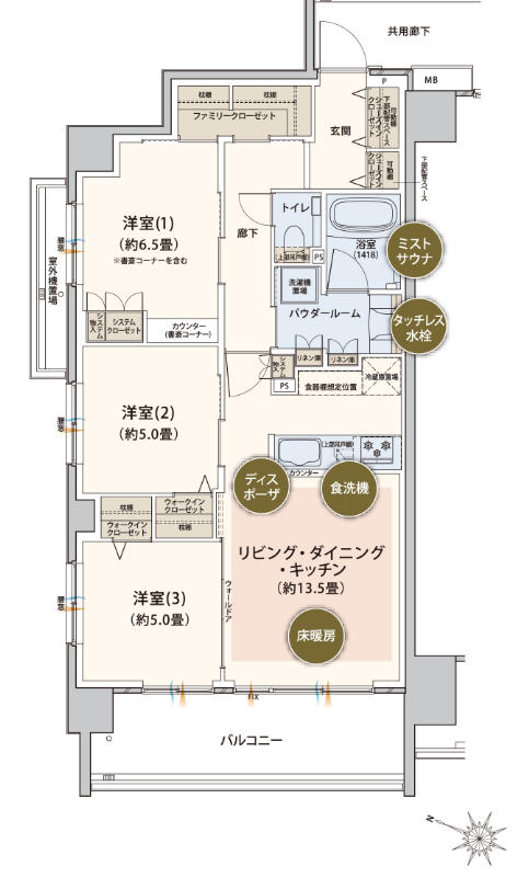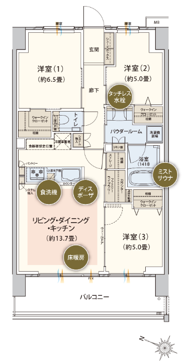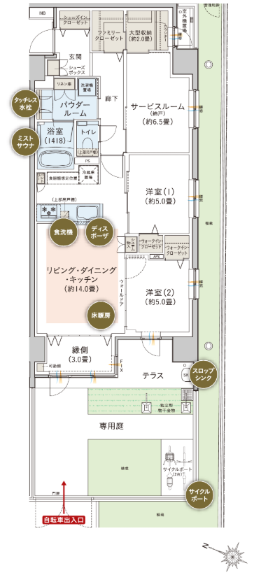 設備仕様としてはディスポーザー、食洗機、ミストサウナ、手洗いカウンター&ローシルエットトイレ、可動式ルーバー面格子、エクセレントウォータープラス、構造は二重床(床スラブ厚200mm~250mm)・二重天井、ゼッチ基準も満たしているなど単価帯からすれば充実しています。