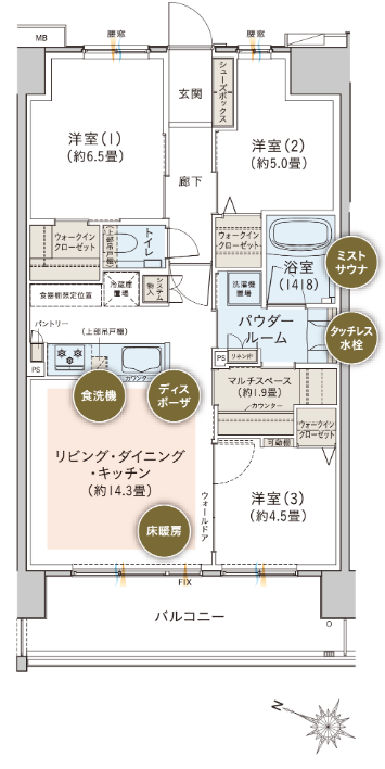 さらにリビングサッシも3連、リビング横の洋室ウォールドアはハイタイプで完全開放できるなど可変性にも優れています。