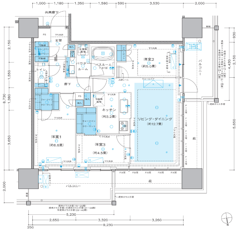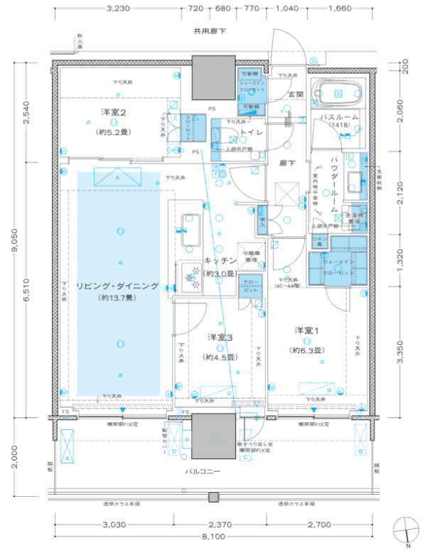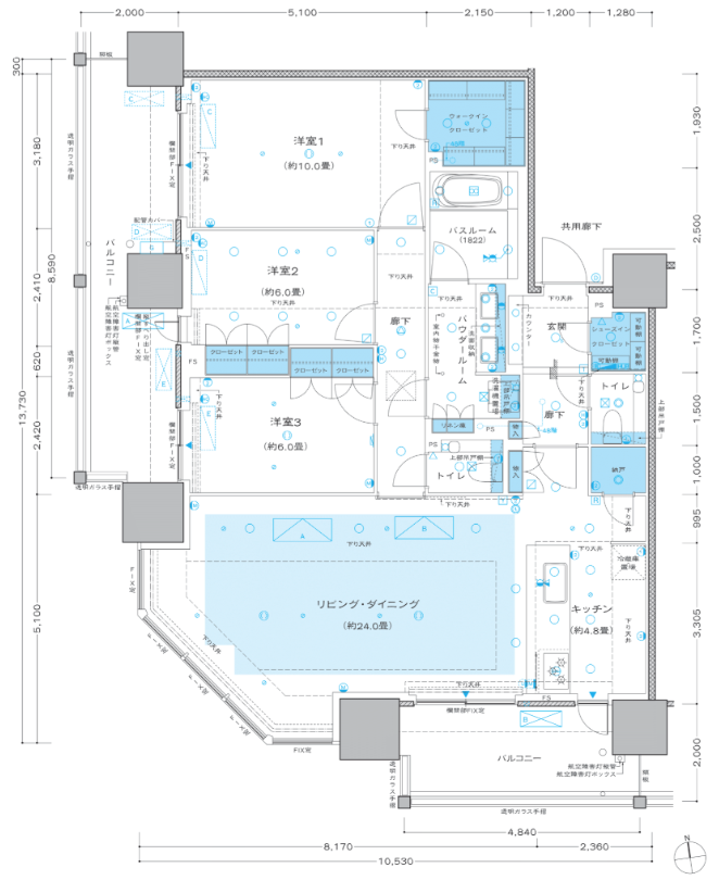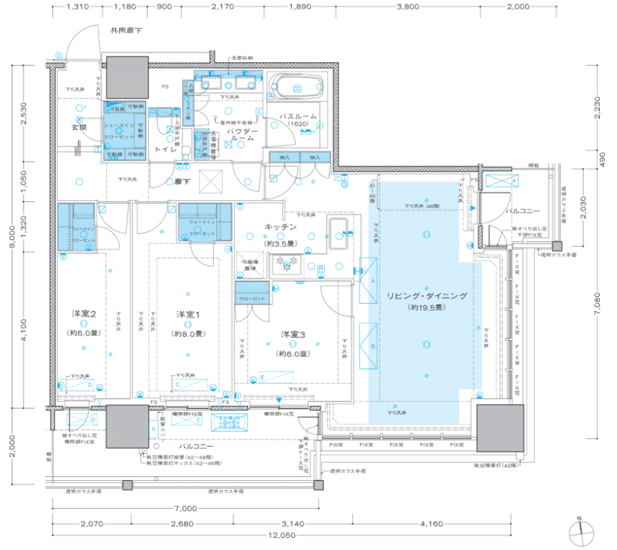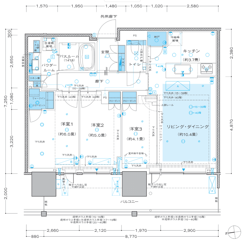 エレベーターは16階までの低層用が3基(分速90m)、17階から35階までの中層用が3基(分速180mm)、16階・35階から51階までの高層用(分速240mm)が3基です。住戸と共用施設が混在する6階はすべて止まります。