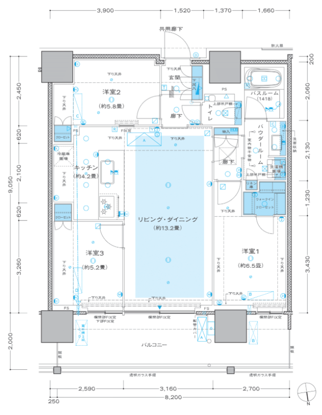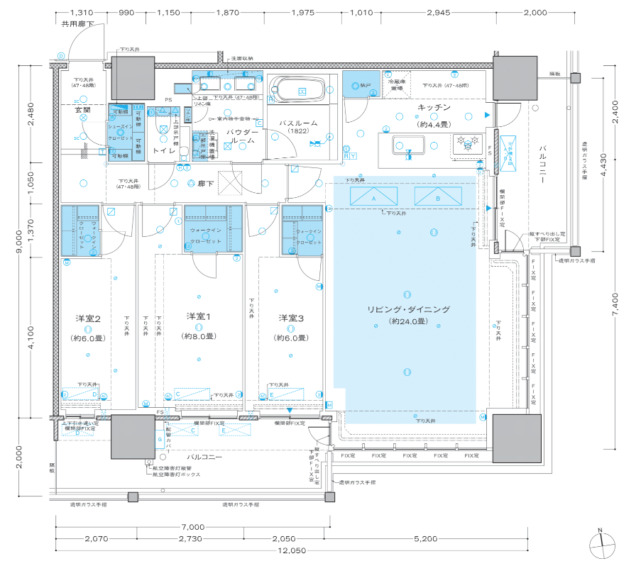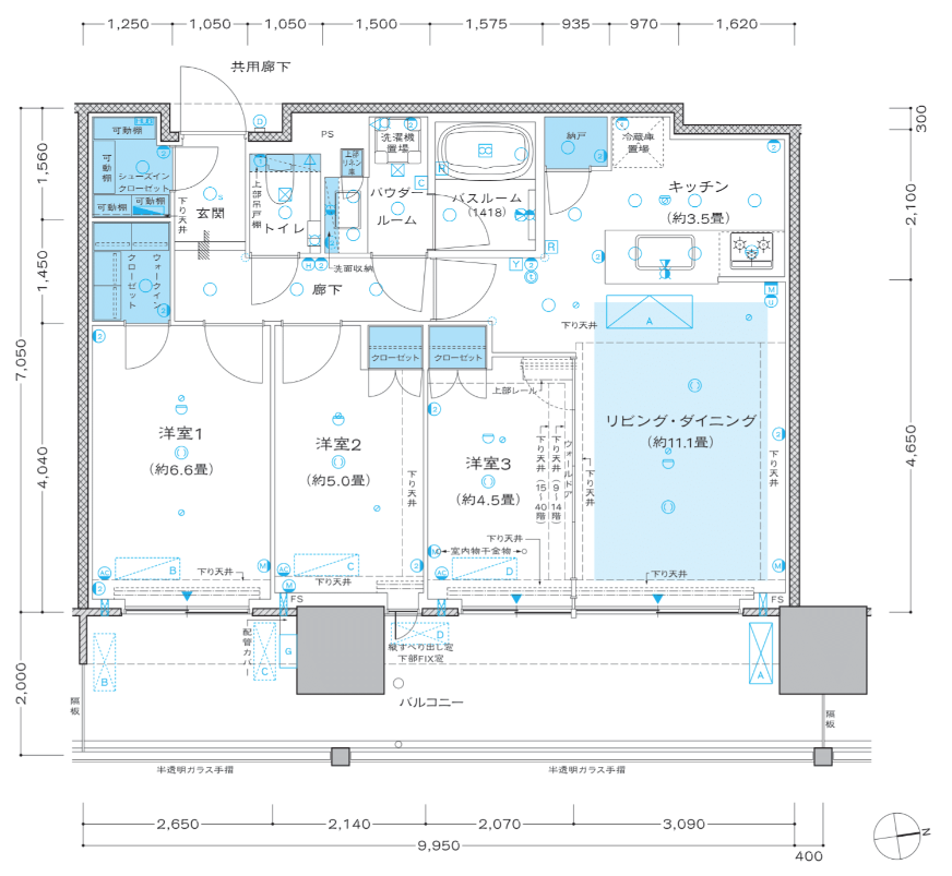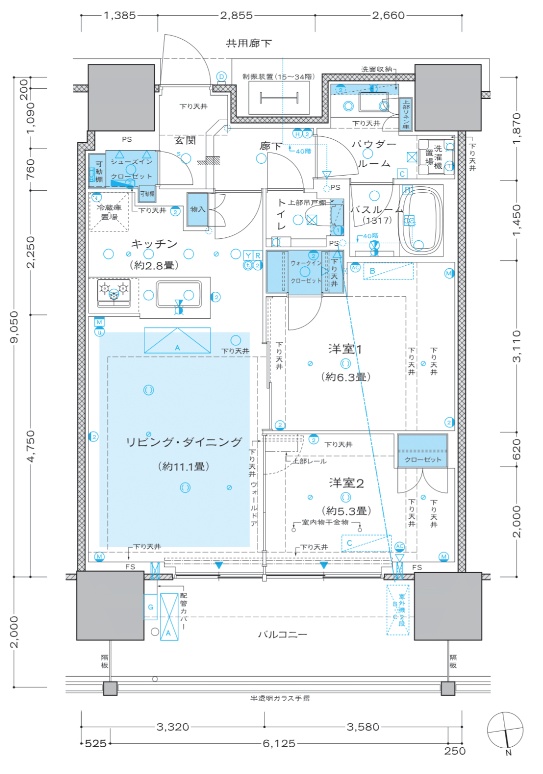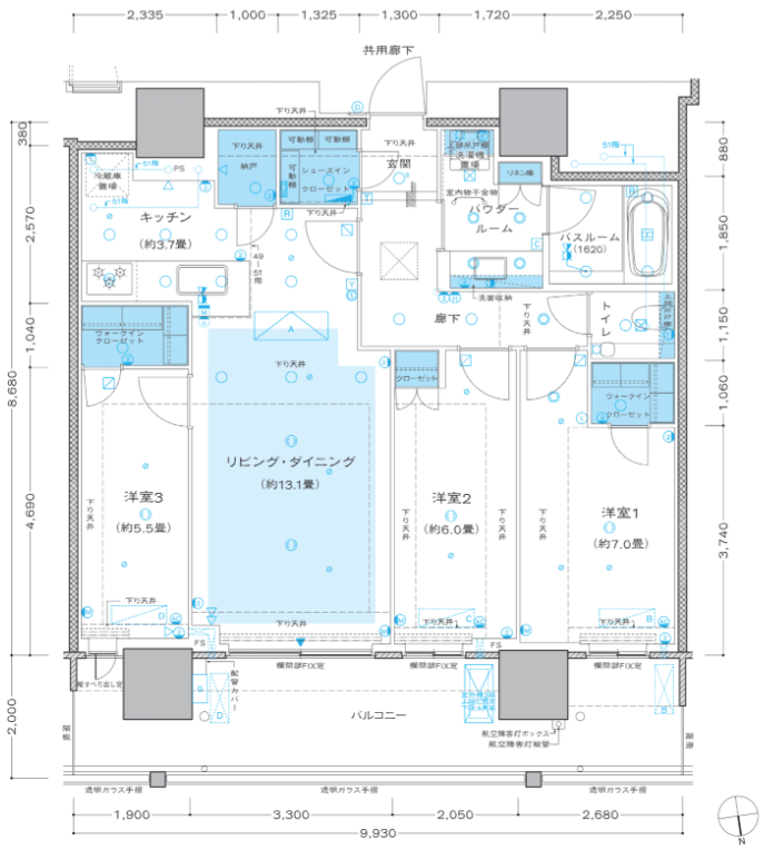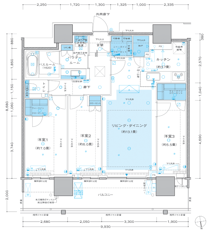 エレベーターは16階までの低層用が3基(分速90m)、17階から35階までの中層用が3基(分速180mm)、16階・35階から51階までの高層用(分速240mm)が3基です。住戸と共用施設が混在する6階はすべて止まります。