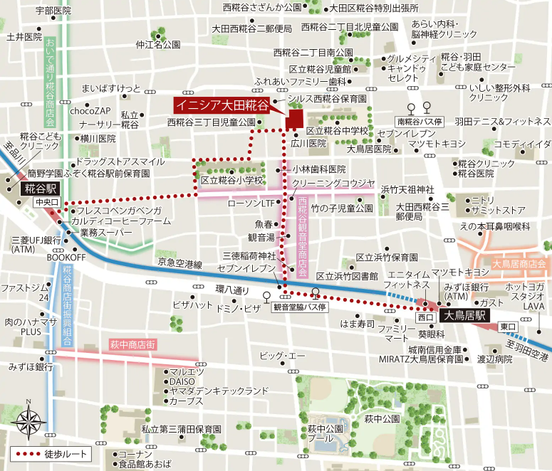 最寄り駅は糀谷と大鳥居でどちらも徒歩10分、京急蒲田に関しては徒歩18分といずれも距離はありますが自転車利用であれば京急蒲田も身近な距離感ではありますね。