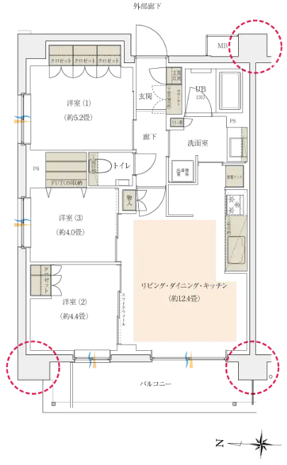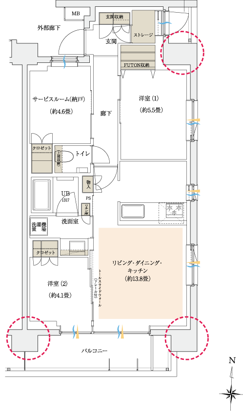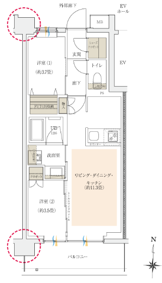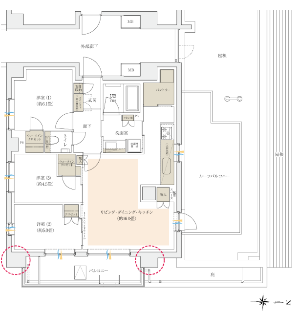 ただ、居室もリビング側の連窓サッシに加えて共用廊下側の柱も外に出したりとイニシアらしさを感じられて良いですね。