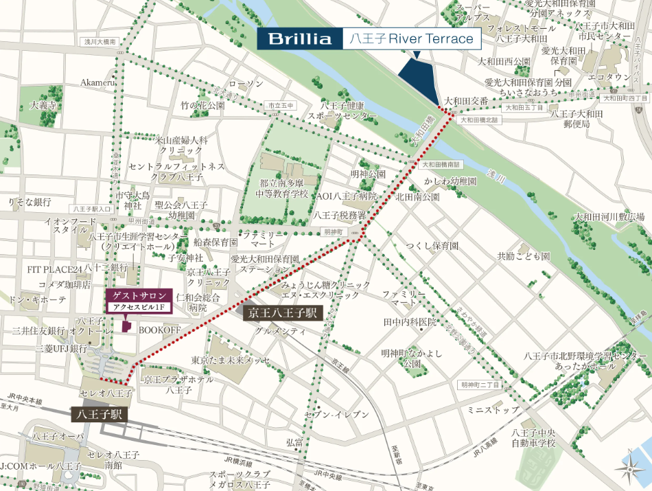 京王八王子駅から徒歩10分、JR各線の八王子駅から徒歩15分、太平洋戦争では多くの人の命を救った大和田橋を渡ってすぐの浅川沿いとなります。駅からは分かりやすい動線でほぼほぼフラットアプローチです。