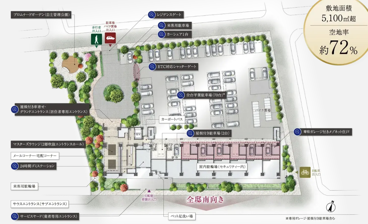駐車場:70台(専有ガレージ6台・平置62台・屋内ガレージ2台)※他来客用1台・カーシェア駐車場1台・身障者用駐車場1台有り