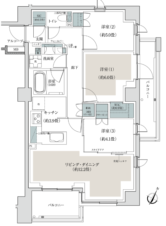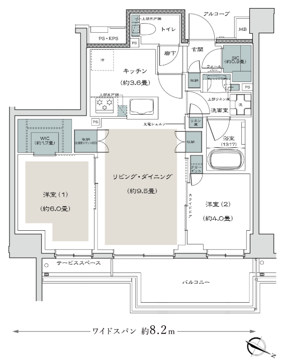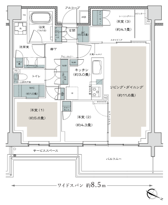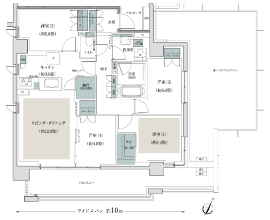内廊下でタワマンでよく見るような間取り形状のため行燈部屋は発生してしまいがちですが主開口部となるバルコニーに面する部屋が田の字よりも多くなります。