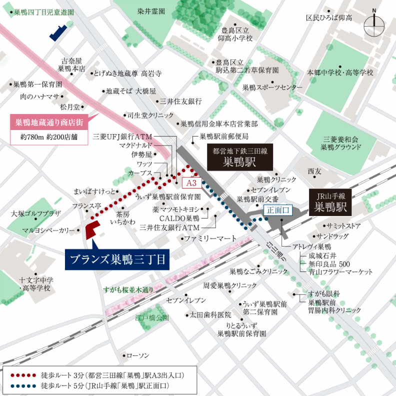 都営三田線とJR山手線の巣鴨駅から北西方面へ徒歩3~5分、江戸橋通り沿いに位置しています。ブリリア巣鴨北山手賓館(2010年築・新築時の坪単価約305万円)の斜め向かいですね。