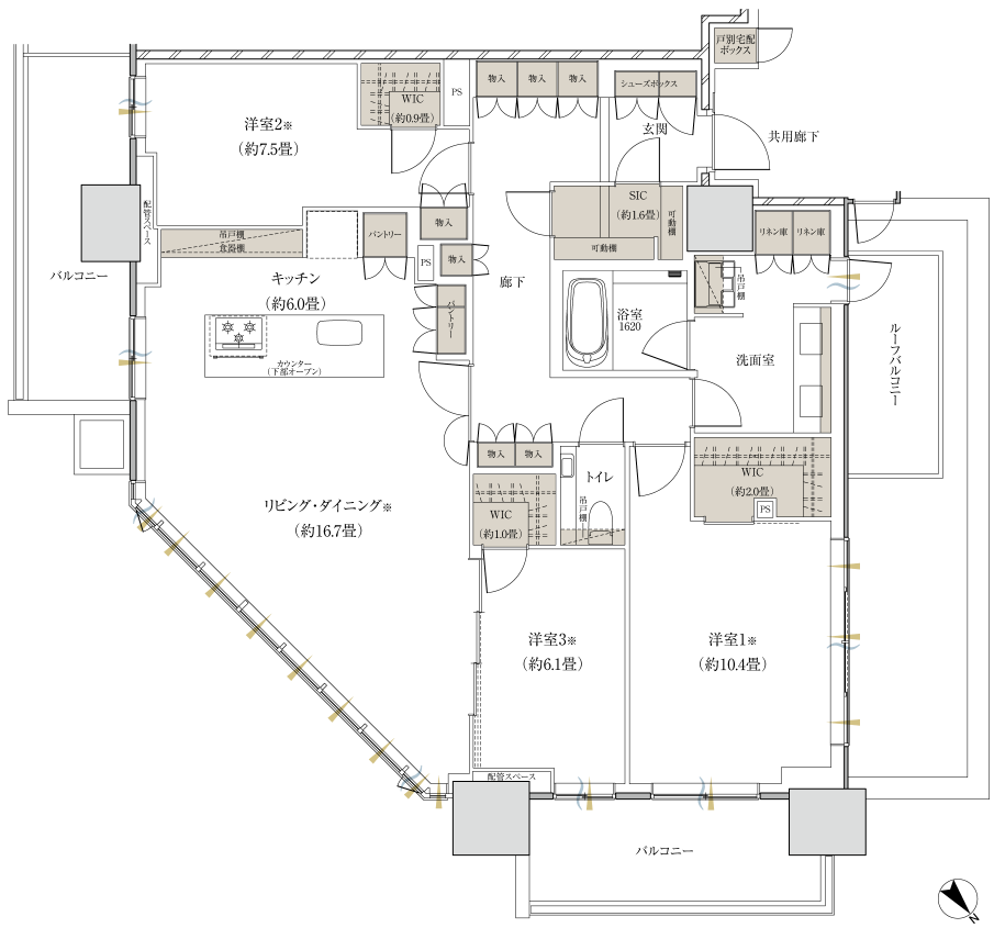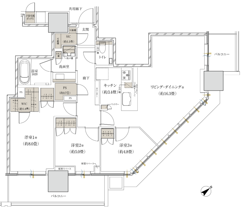 せっかくのスペシャルな日当たり&眺望のマンションなのですから柱や壁の位置を洋室側に逃がしてリビングの開放感を確保してほしかったところではあります。(高いお金支払って角住戸買いなさいよ!という売り手のメッセージ?!)
