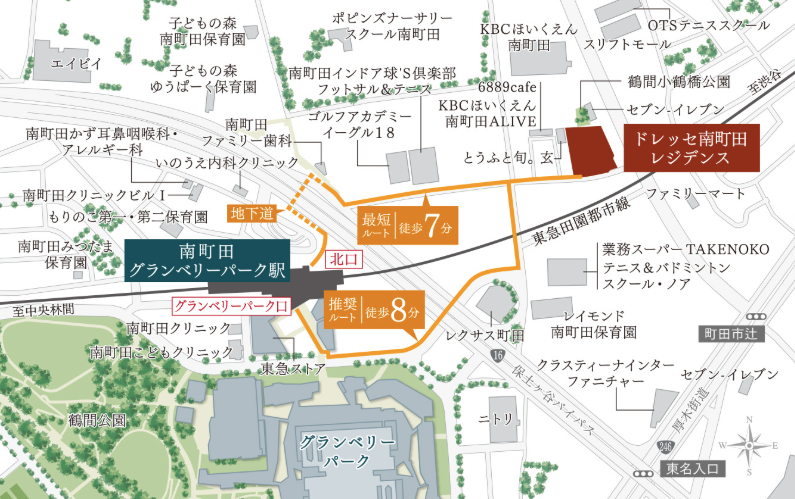 駅徒歩5分のドレッセ南町田フロント、駅徒歩21分のドレッセ南町田グランヴィラ、ドレッセ南町田レジデンスの3作を同時供給中の東急×南町田、レジデンスに関してはバイパスを超えた徒歩7分となります。