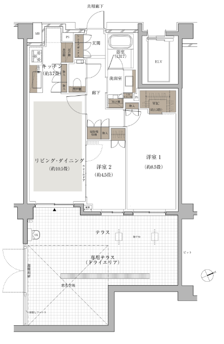 専有面積:63.61㎡~104.82㎡(408号室のみトランクルーム面積0.77㎡を含む)