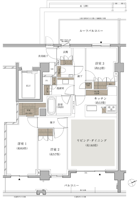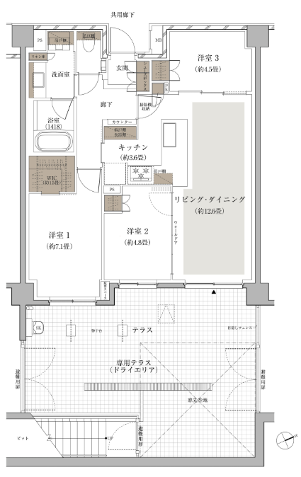 最上階のプレミアムはリビング天カセ、住戸によっては洗面ダブルボウル、ルーフバルコニーウッドデッキ、トランクルームなどスペックが高くなります。