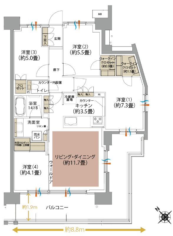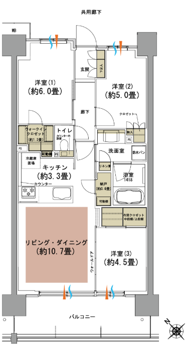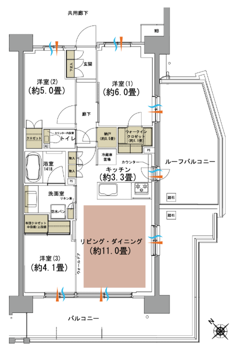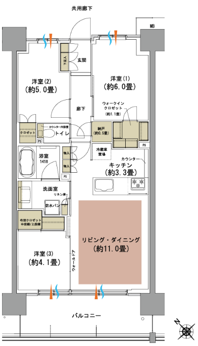若干専有面積調整(グロスを抑えるために部屋を狭くする)はされていますがナロースパンではないこともあり廊下が長くなく有効面積としては悪くないでしょう。
