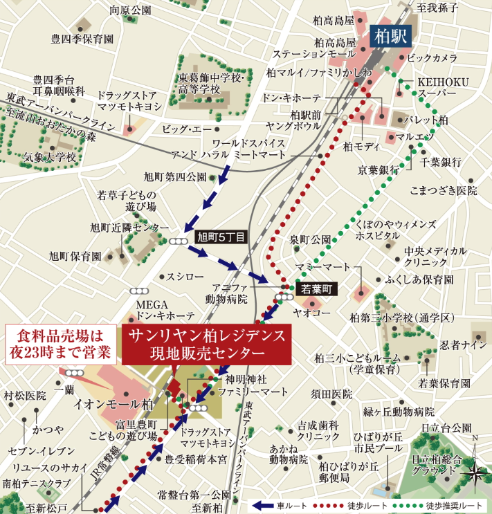 日常の買い物はイオンモールはもちろんのこと水戸街道沿いのメガドンキが徒歩6分、旧水戸街道沿いの業務スーパーが徒歩8分、ヤオコーが徒歩10分など駅前以外でも選択肢が充実していますし、バスへ乗車する前に柏駅で買い物をしても良いですね。