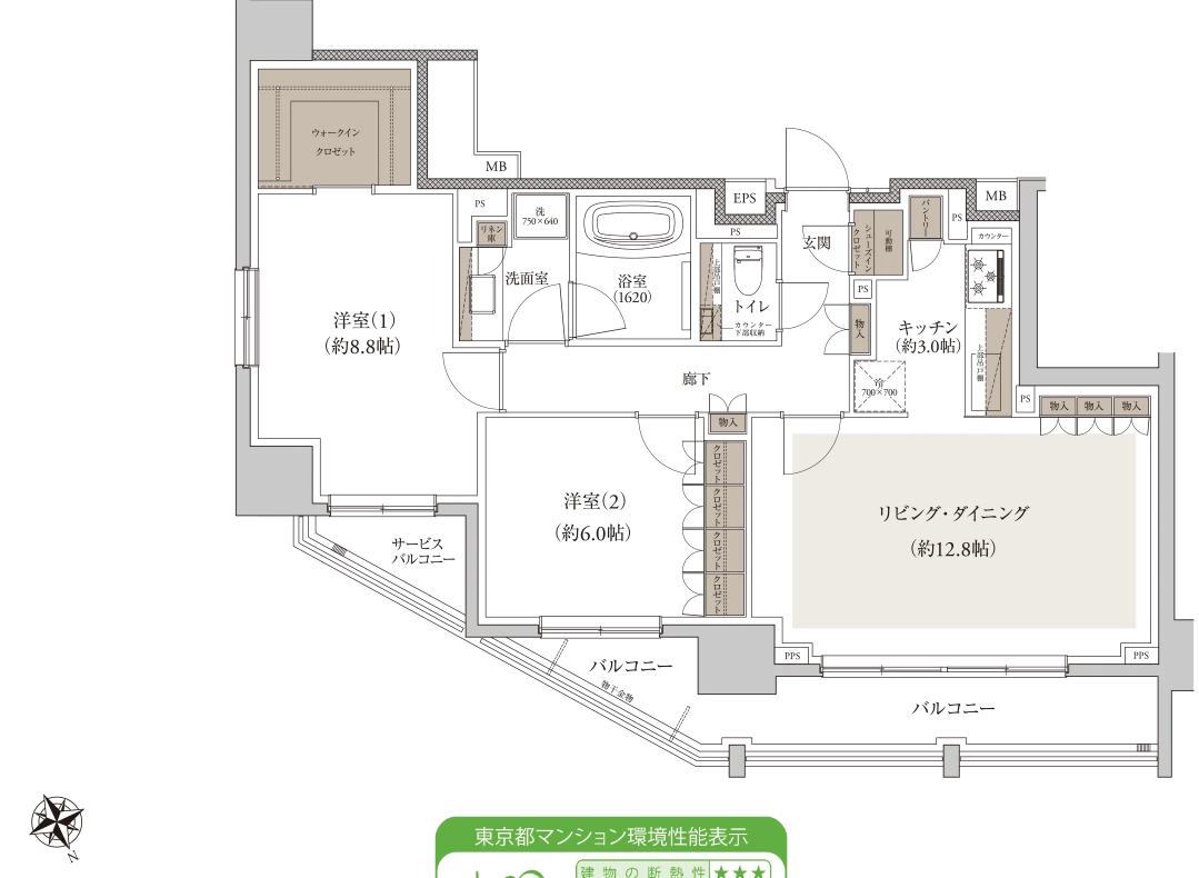 76㎡台の2LDKはワイドスパンの角住戸で折り上げ天井のリビング窓面が4連、浴室サイズ1620など単価帯らしいゆとりを感じられます。